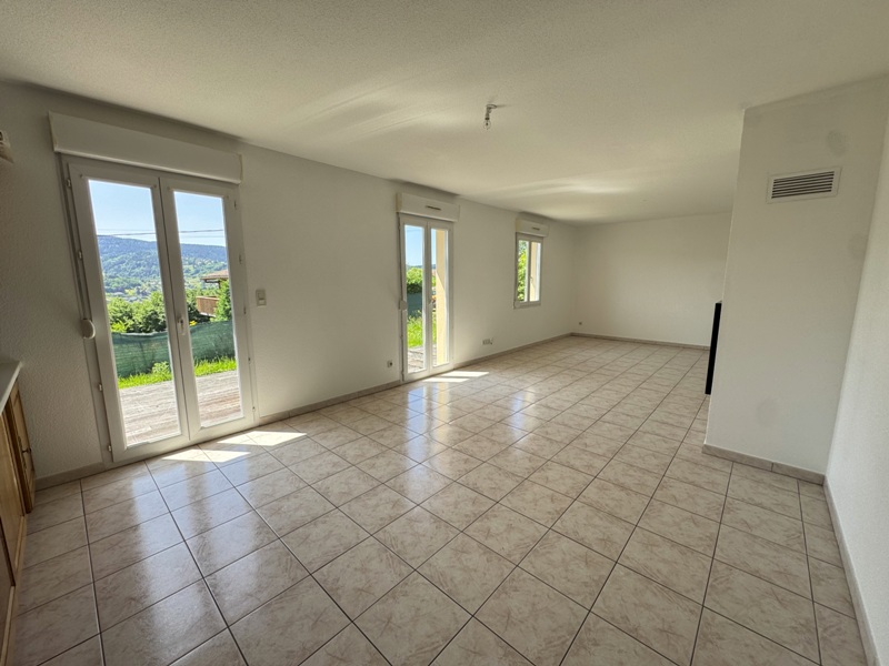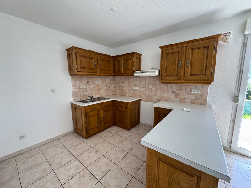 Maison comprenant entrée avec dégagement et placard, cellier, salle d'eau (douche et lavabo), cuisine aménagée ouverte sur pièce à vivre avec cheminée et accès terrasse, 3 chambres, WC séparés.